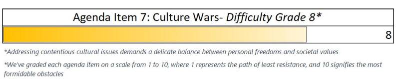 | Agenda Item 7: Culture Wars | Addressing contentious cultural issues demands a delicate balance between personal freedoms and societal values |
